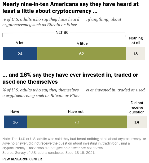 To comment a bit on scale, impact and penetration, the Pew Research Center believes that nearly 90% of Americans have heard of cryptocurrency and 16% say they have invested, traded or used cryptocurrency. To put this in perspective, Pew polled the market on Bitcoin in 2015, too: Only 48% of Americans had heard of it and less than 1% had interacted with it!